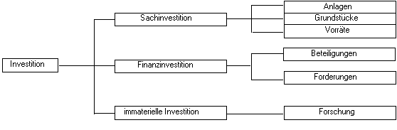 Unter Investition verstehen wir die Verwendung von finanziellen Mitteln zur Beschaffung von Sachvermögen, immateriellem Vermögen oder Finanzvermögen, d. h. die Beschaffung von Potentialfaktoren. (Maschinen, Vorräte, Patente, Lizenzen, Wertpapiere, Beteiligungen, Weiterbildung von Mitarbeitern, Forschung und Entwicklung)