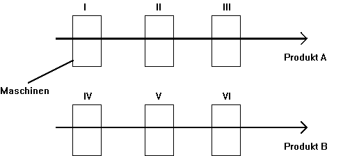 | Fließfertigung | Anordnung der Betriebsmittel und Arbeitsplätze nach dem Produktionsablauf, d.h. der Durchfluss des Materials vom Rohstoff bis zum Fertigprodukt erfolgt ohne Unterbrechung, z.T. Fließband mit Taktsollzeiten. | |